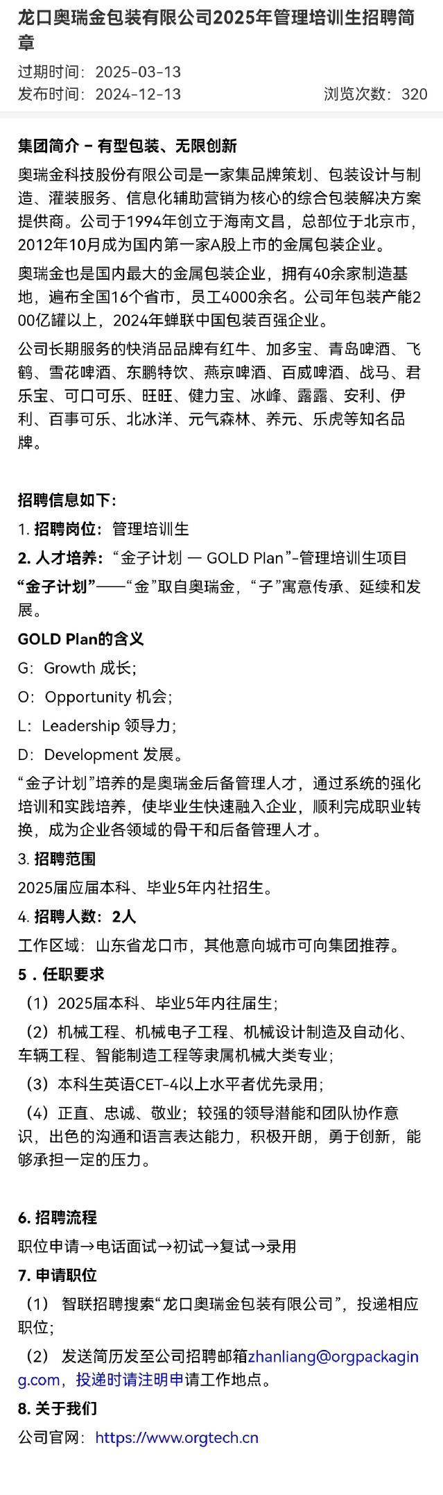 招聘 龙口奥瑞金包装有限公司2025年管理培训生招聘简章