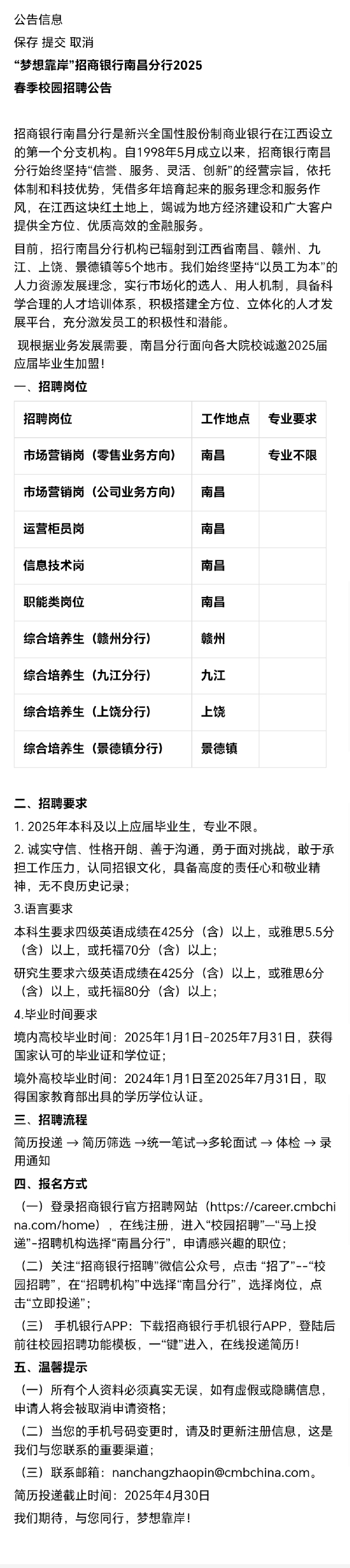 招聘 “梦想靠岸”招商银行南昌分行2025春季校园招聘