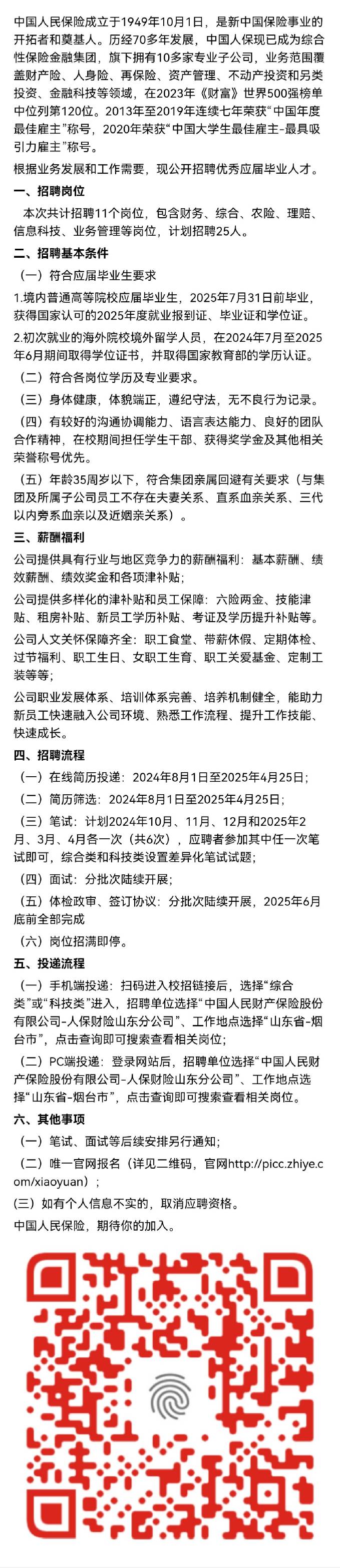 招聘 中国人民财产保险股份有限公司烟台市分公司2025年校园招聘