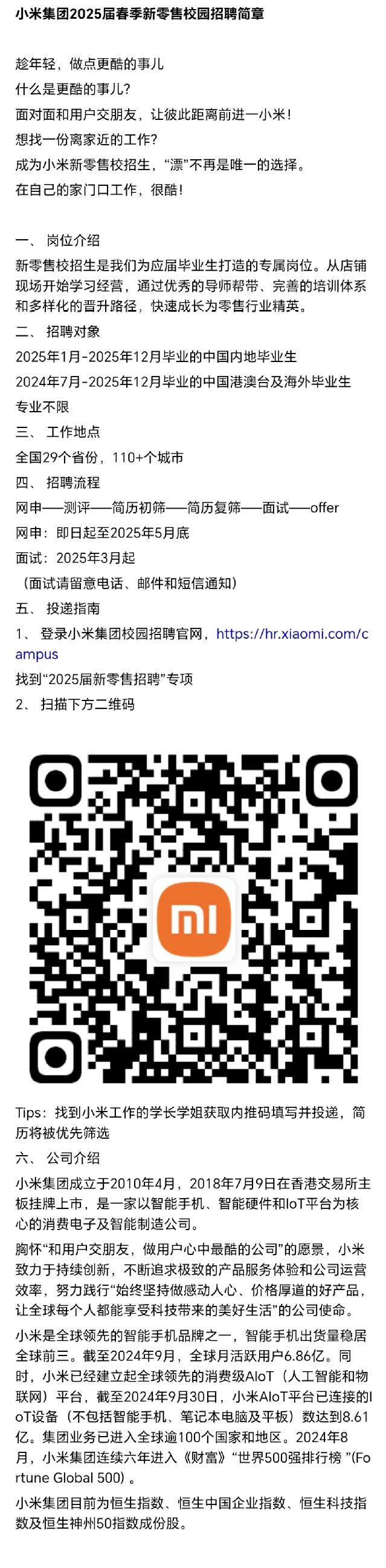 招聘 小米集团2025届秋季新零售校园招聘简章