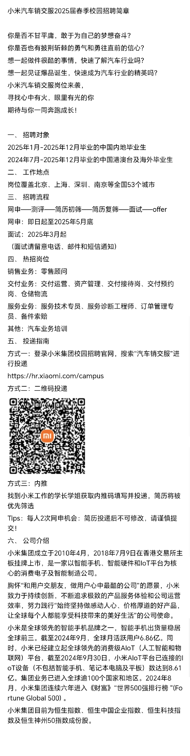 招聘 小米汽车销交服2025届春季校园招聘简章