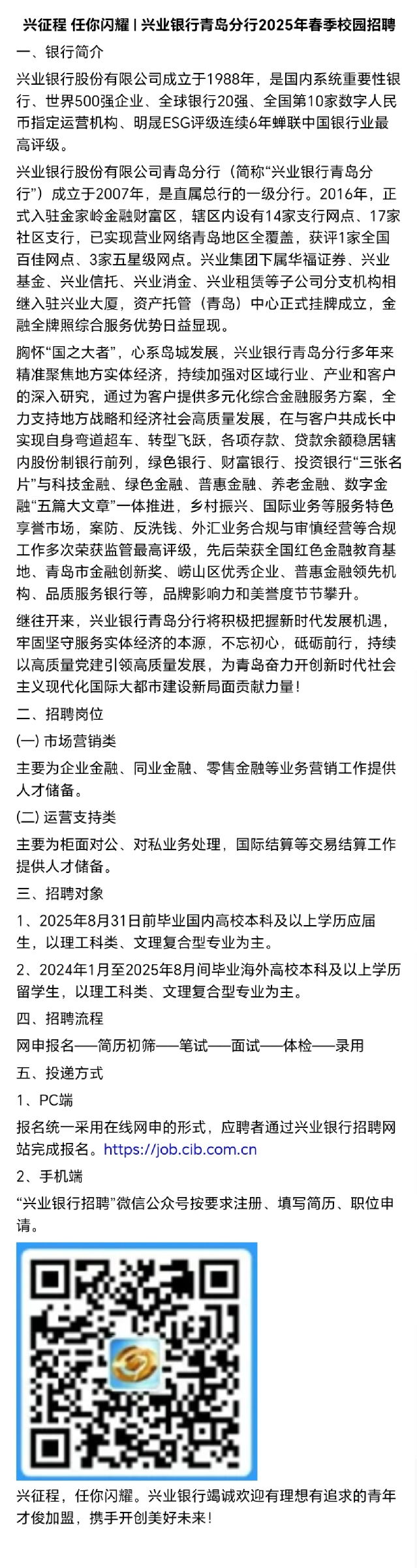 招聘 兴业银行青岛分行2025年春季校园招聘