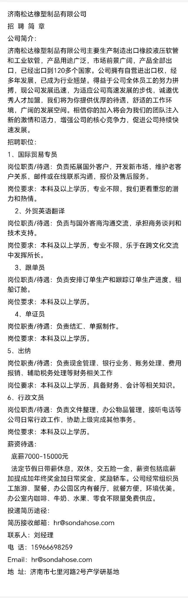 招聘 济南松达橡塑制品有限公司