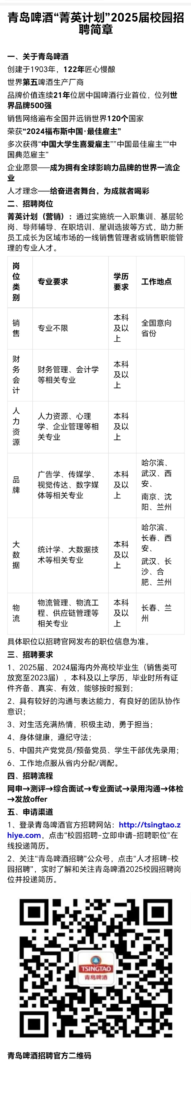 招聘 青岛啤酒“菁英计划”2025届校园招聘简章