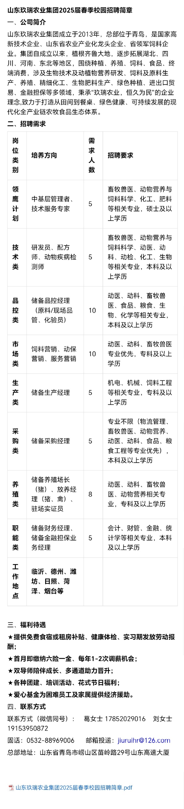 招聘 山东玖瑞农业集团2025届春季校园招聘简章