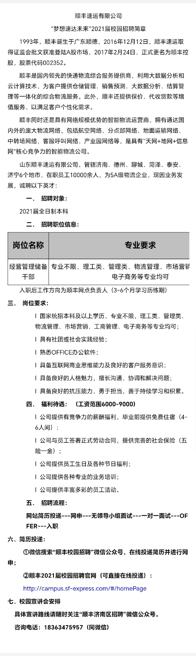 招聘 顺丰速运有限公司“梦想速达未来”2021届校园招聘简章