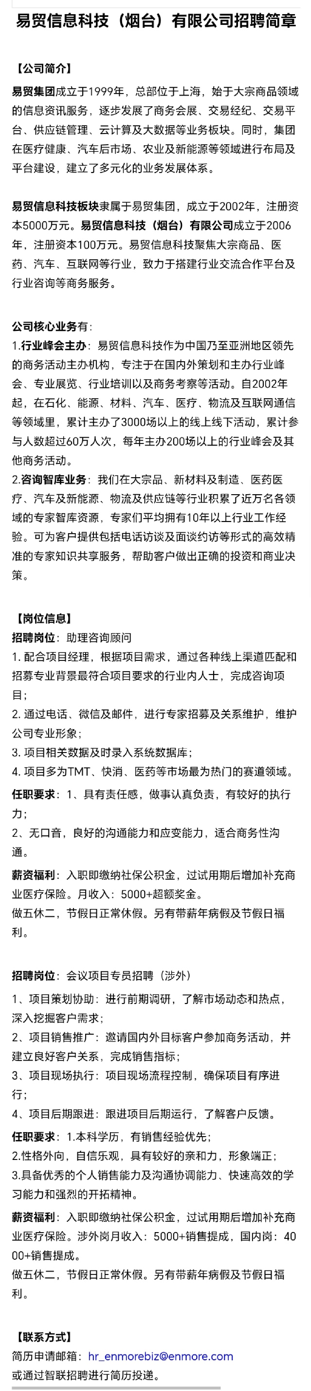 招聘 易贸信息科技(烟台)有限公司招聘简章
