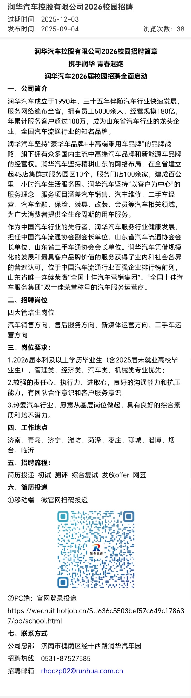 招聘 润华汽车控股有限公司2026校园招聘