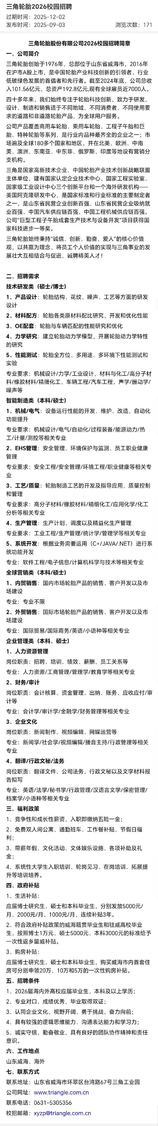 招聘 三角轮胎2026校园招聘