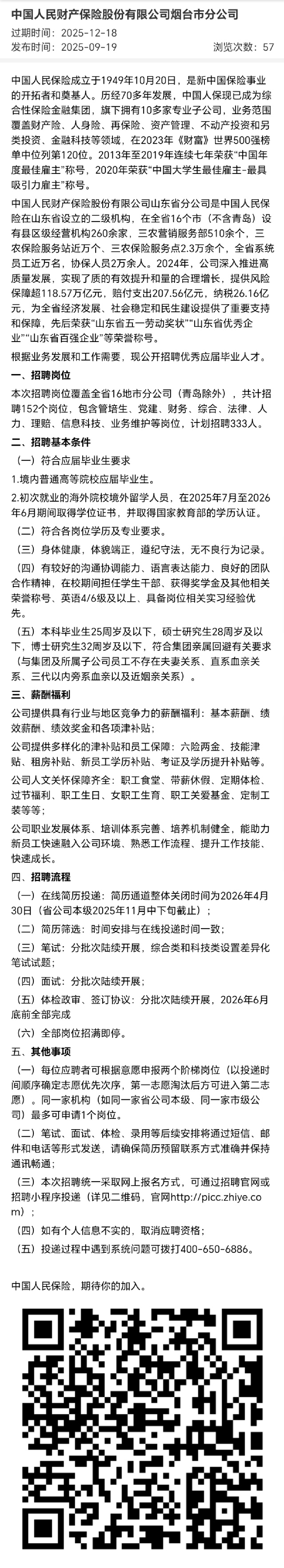 招聘 中国人民财产保险股份有限公司烟台市分公司