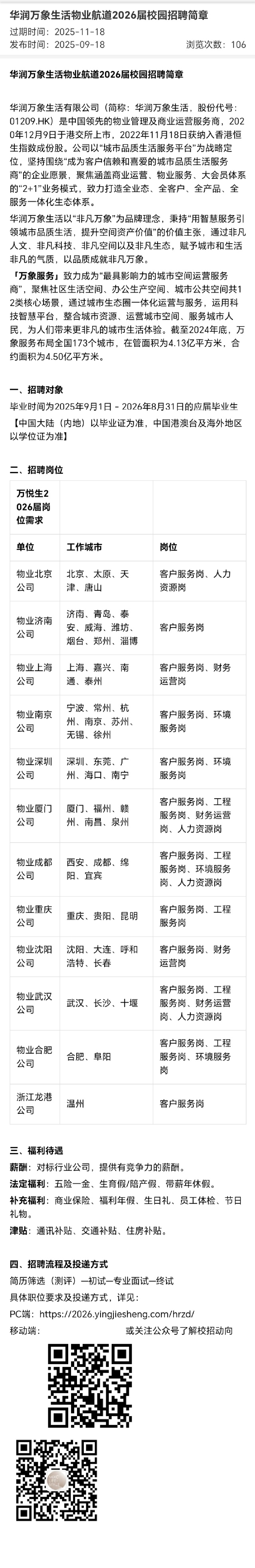 招聘 华润万象生活物业航道2026届校园招聘简章