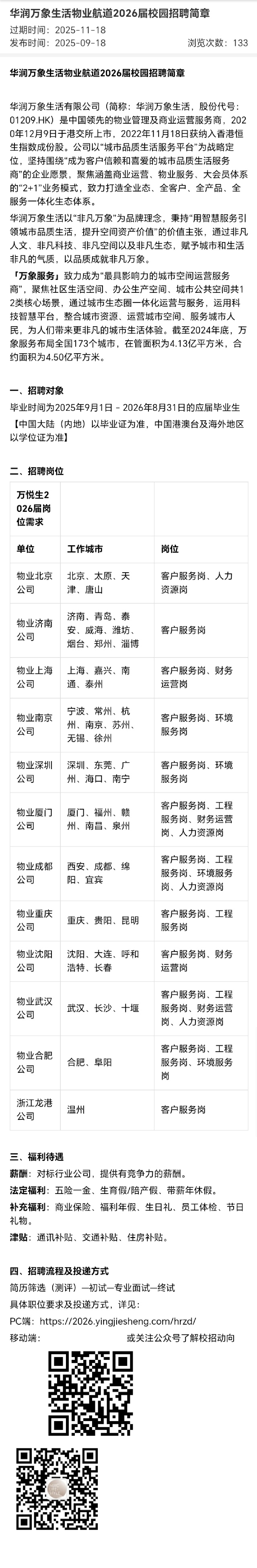 招聘 华润万象生活物业航道2026届校园招聘简章