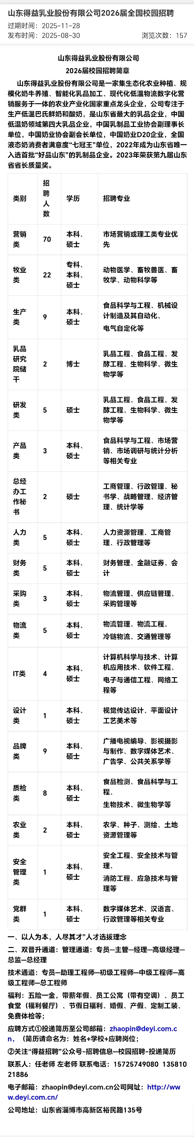 招聘 山东得益乳业股份有限公司2026届全国校园招聘