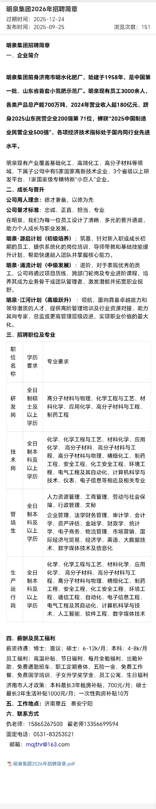招聘 明泉集团2026年招聘简章