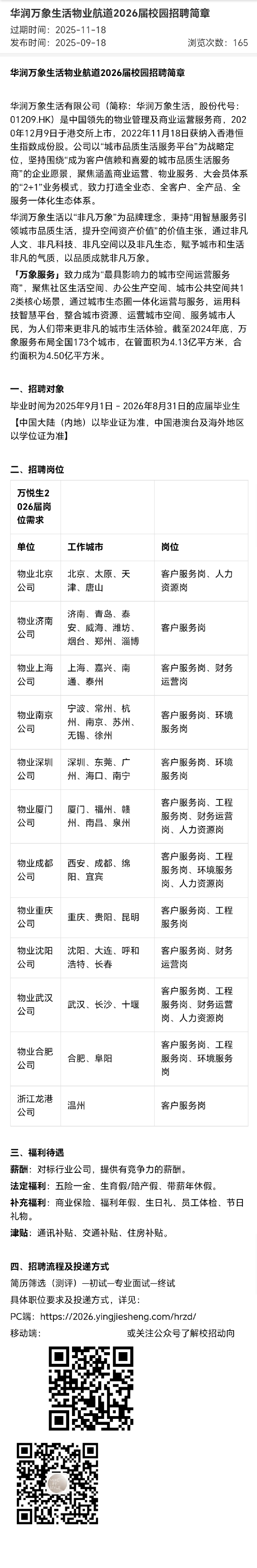 招聘 华润万象生活物业航道2026届校园招聘简章