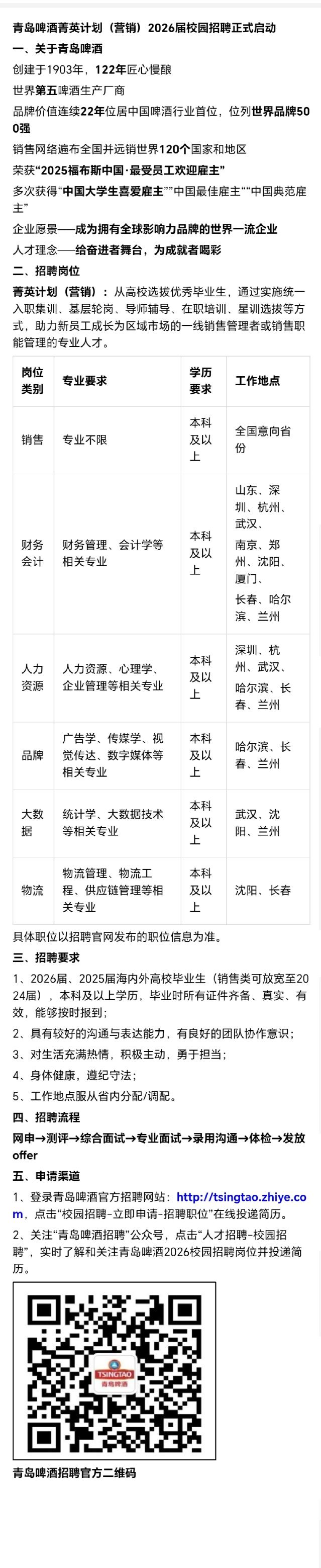 招聘 青岛啤酒菁英计划2026届校园招聘