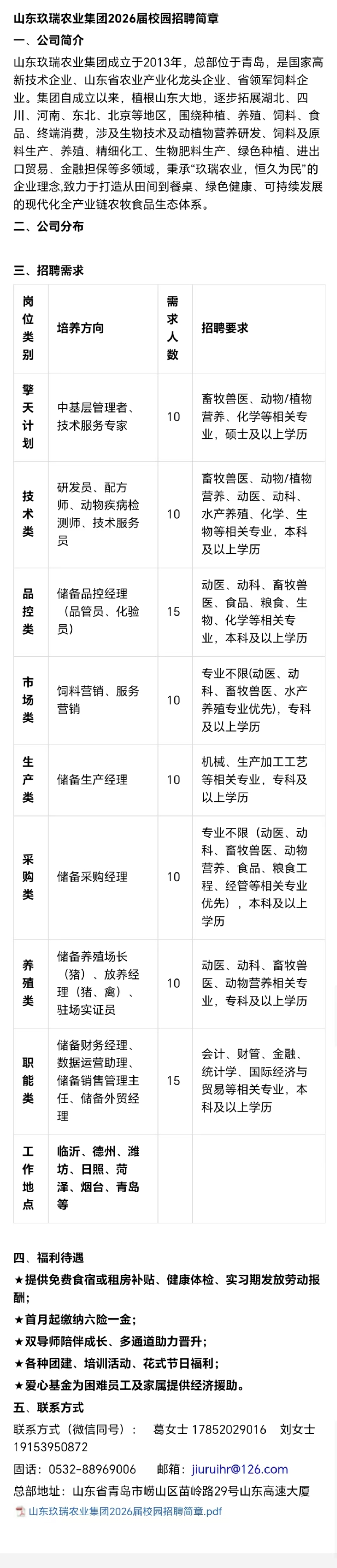 招聘 山东玖瑞农业集团2026届校园招聘简章