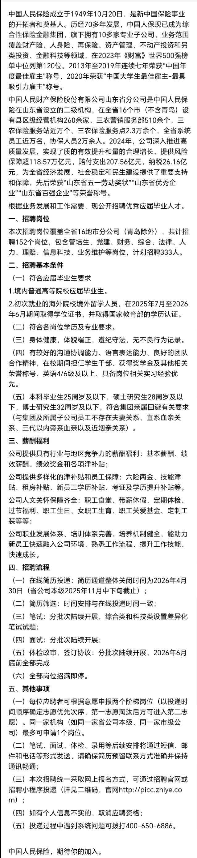 招聘 中国人民财产保险股份有限公司招聘简章