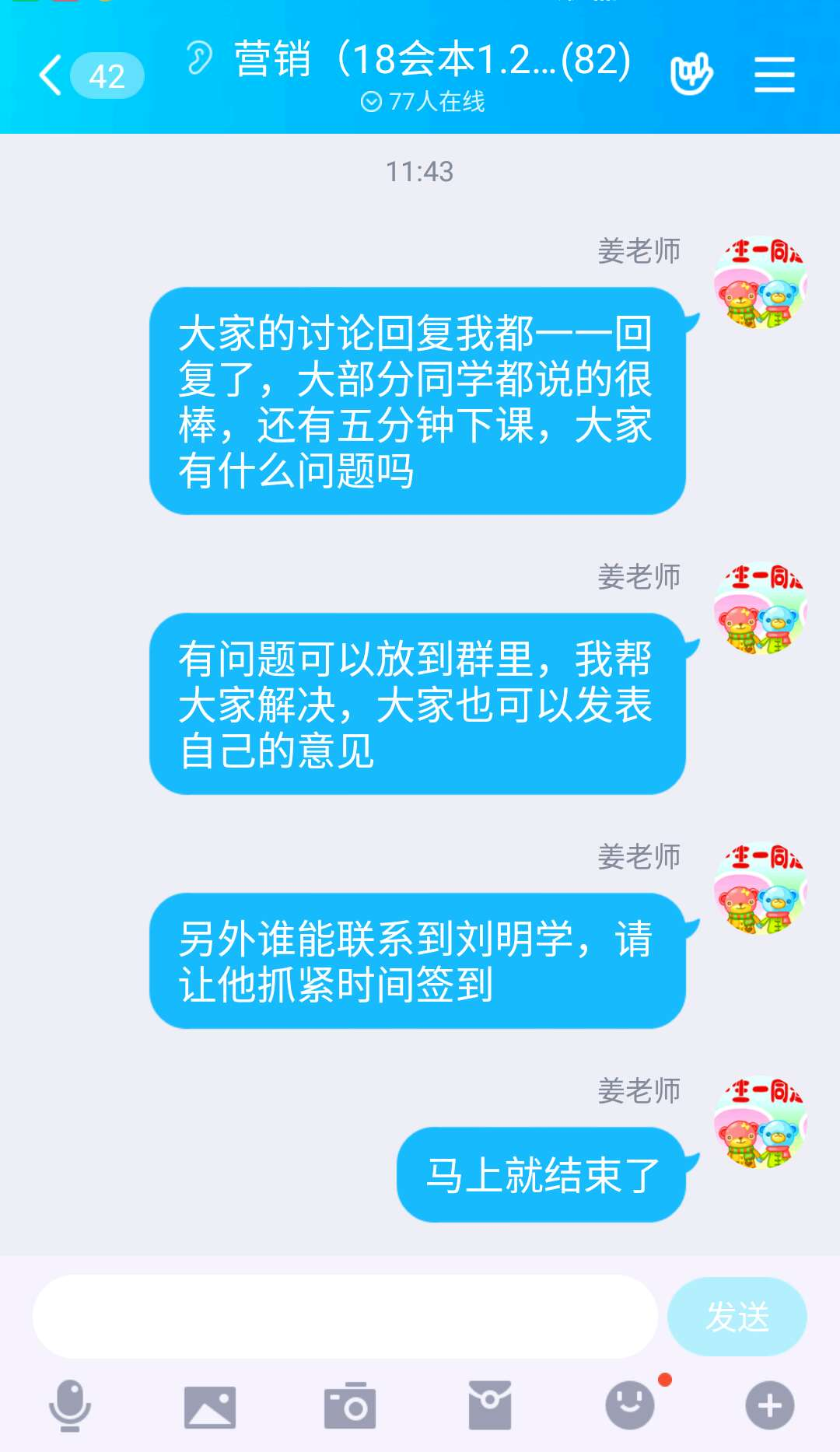 每次上课前10分钟发布课堂签到,并在上课准时跟学生发布本节任务,下课时在QQ群里跟学生打招呼下课,并再次询问学生有无问题。
