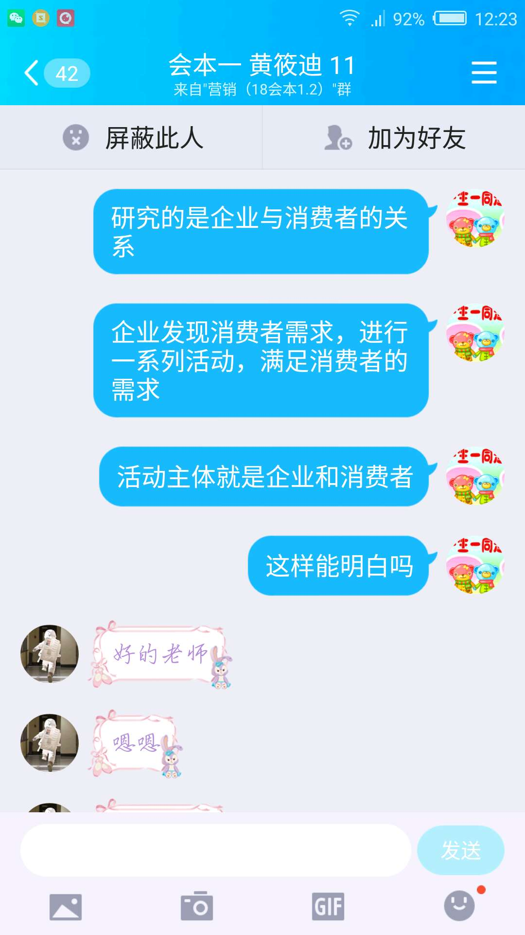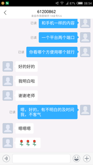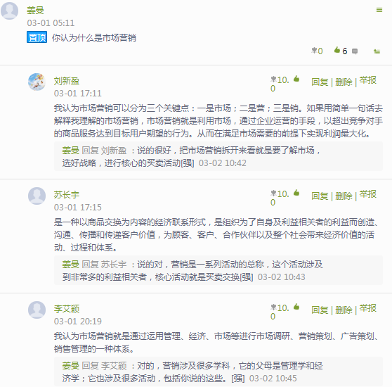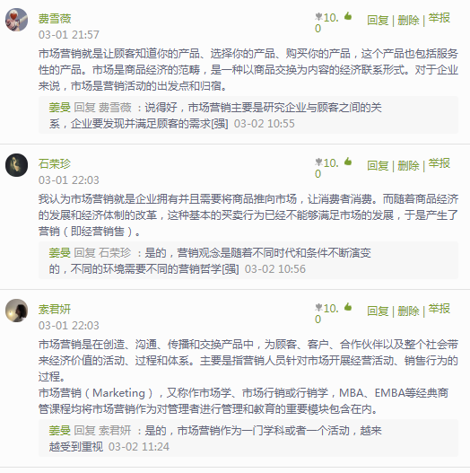 以上是《市场营销学》第一章“市场营销导论”的网络教学情况。由于家庭环境限制,本课程未开展直播课程,主要是提前为学生准备好学习资料,采用在线反转的形式,以学生自学为主,老师布置课堂讨论和作业,一直在线随时等待为学生答疑,及时处理学生提出的问题,对学生的学习进度和成果进行反馈。