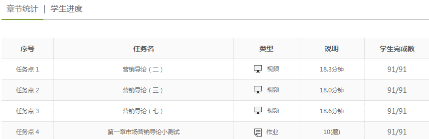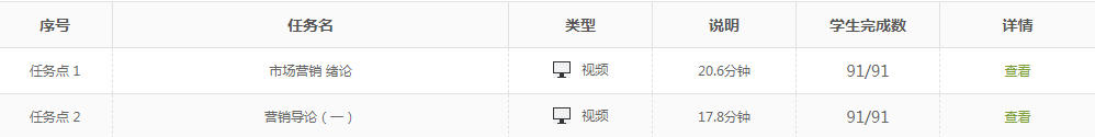 由于《市场营销学》是全校都上的大课,老师们采用了集体备课的形式,统一采用南开大学李桂华教授的网络公开课视频作为学生统一的学习资料。在上课之前本人将这一章的教学视频先浏览一遍,根据章节内容将视频插入学习通每一章的学习任务里,一般一次课2个视频左右,一个视频20分钟左右。给学生设置任务点,看完进度才算完成任务。