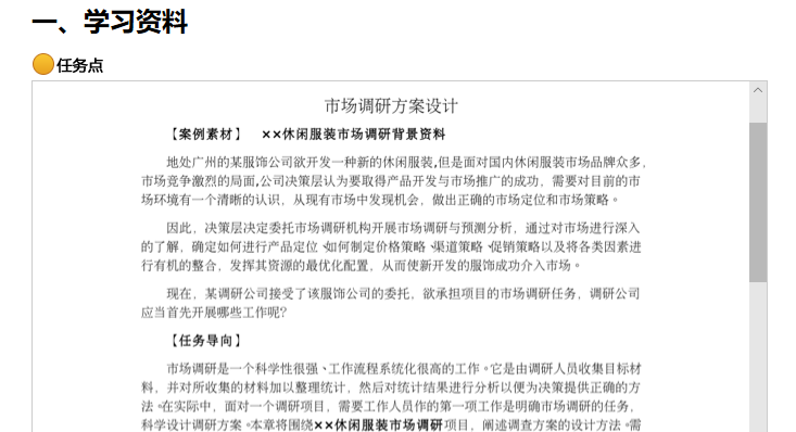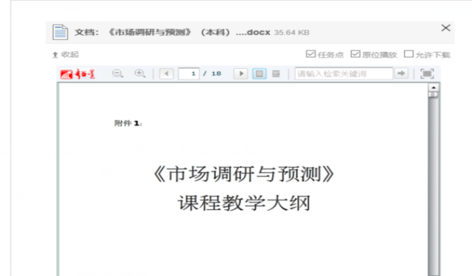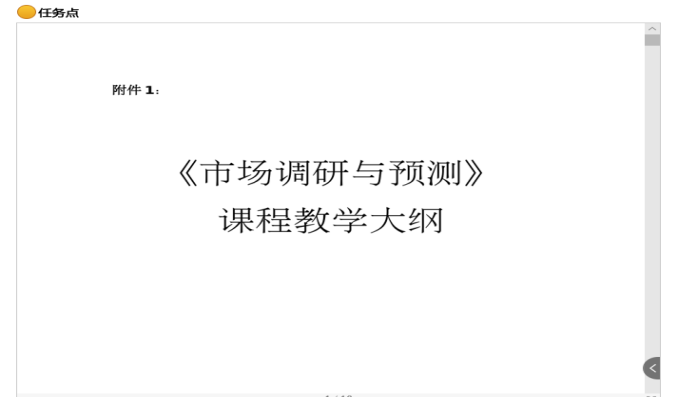 学生手里没有教材,为更好开展线上教学,帮助学生更好地把握课程知识体系,把《市场调研与预测教学大纲》作为任务点嵌入课程章节体系,并设置防拖拽完成的要求。