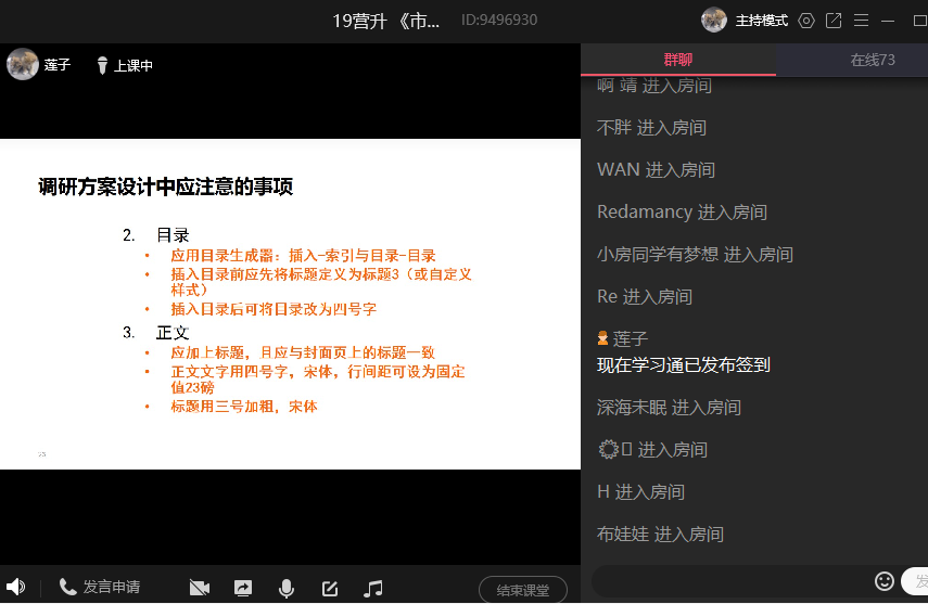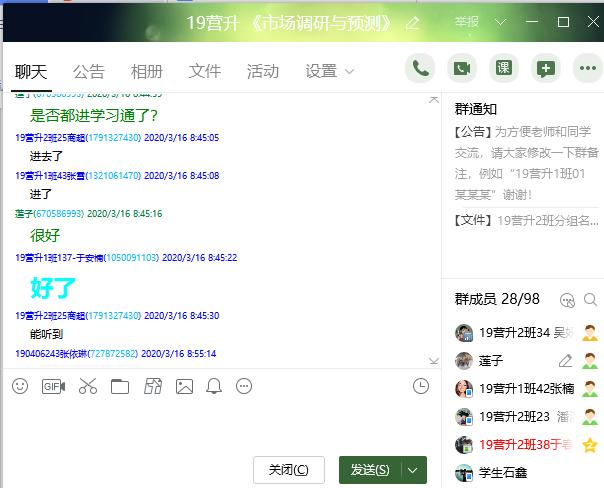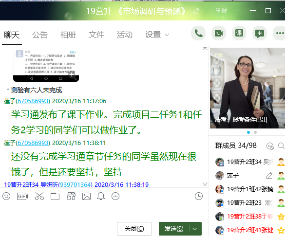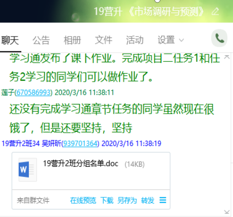 8、回到QQ直播。课堂小结,结合案例总结调研方案设计的撰写注意事项。布置作业,学习通和QQ群双向信息传递。