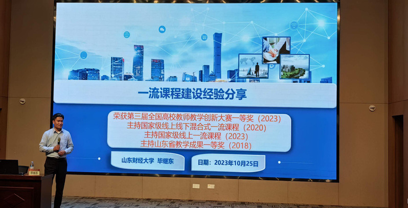 毕继东教授首先以主持的国家级线上线下混合式一流课程《企业运营管理仿真综合实验》为例,从课程概述、教学设计、团队建设、创新实施、创新成效五个方面介绍了混合式虚拟仿真实验课程的建设经验。