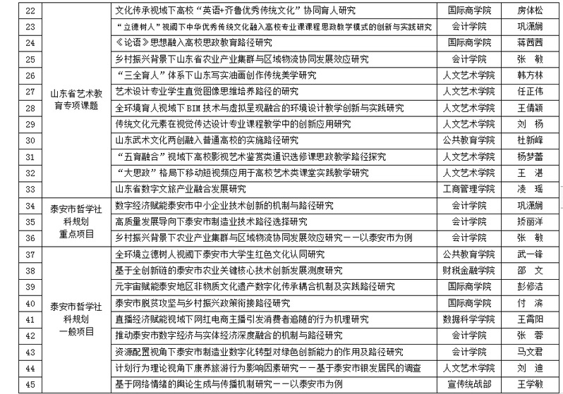 泰安市哲学社会科学工作办公室公布了泰安市2023年度哲学社会科学规划研究项目立项名单,我校共获批12项,其中,重点资助项目3项,一般项目9项。