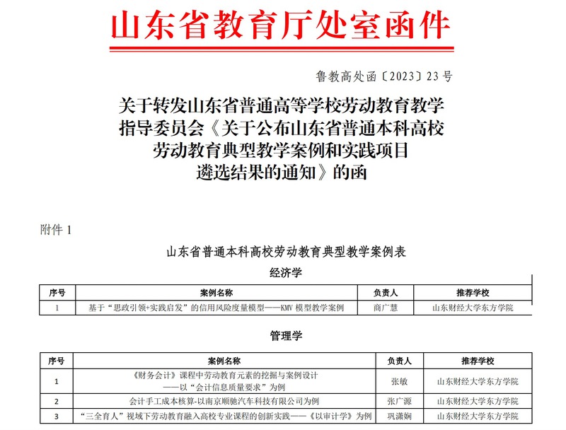 近日,山东省普通高校劳动教育教学指导委员会公布了山东省普通本科高校劳动教育典型教学案例和实践项目遴选结果,我校4项案例入选劳动教育典型教学案例,入选数量居于全省同类院校前列。据悉,本次评选活动根据不同学科门类,全省共入选教学案例97项,实践项目127项。