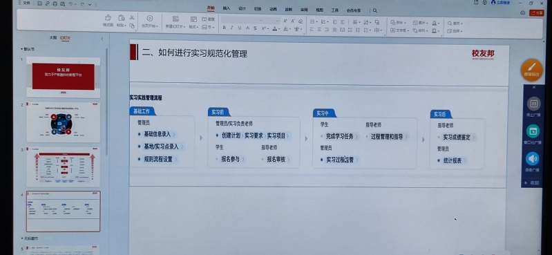 为了提升我校实习实践教学的质量,增强实习实践的信息化水平,并逐步实现校外实习活动的过程化、规范化管理,我校于12月13日上午在弘毅楼6302组织召开了“校友邦”实习实践平台培训会。教务处有关负责人、各学院主管教学副院长、教学秘书以及部分实习指导教师参加了此次培训会,会议由教务科研处副处长刘树峰主持。浙江校友邦科技有限公司服务总监李仕敏从不同的管理角色入手,详细介绍了“校友邦”实习实践平台的具体功能、操作方法以及操作流程。他具体针对实习计划的创建、基础信息的导入、指导教师的分配等内容进行了讲解与演示。在培训过程中,各位老师积极参与互动,李总监根据各位老师在使用过程中遇到的问题进行了针对性的指导和说明。
