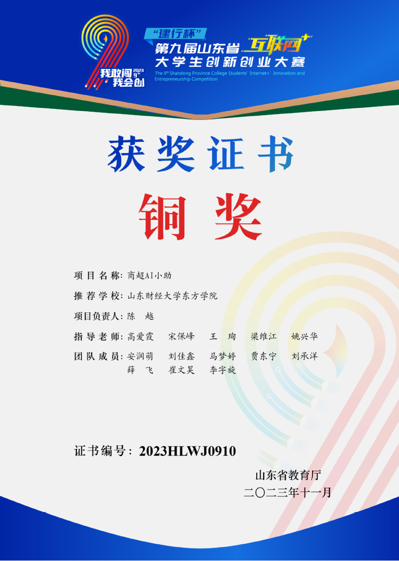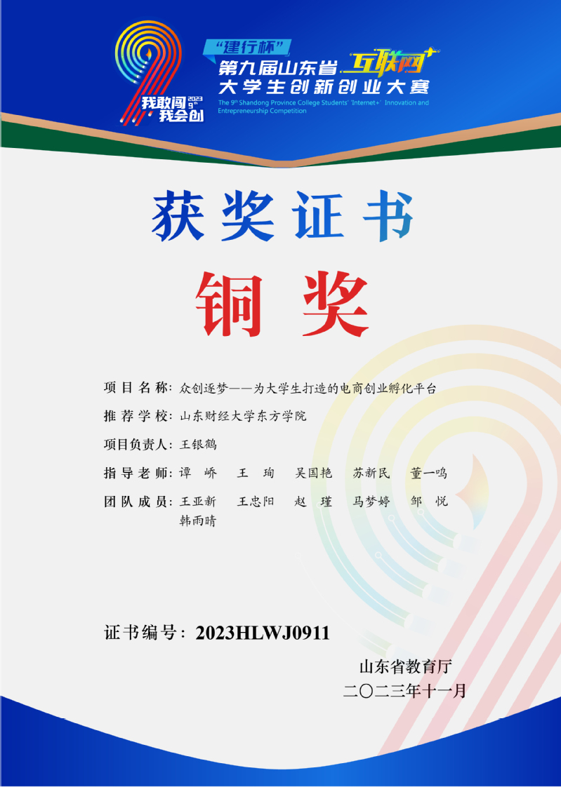 山东省教育厅近期发布了《关于公布“建行杯”第九届山东省“互联网+”大学生创新创业大赛获奖名单的通知》(鲁教高函〔2023〕33号),hjc222黄金城官网参赛团队荣获铜奖2项。