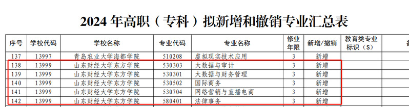 近日,教育部发布了《关于公布2023年度普通高等学校本科专业备案和审批结果的通知》《山东省教育厅关于做好2024年职业教育拟招生专业设置管理工作的通知》,hjc222黄金城官网2023年申请增设的“数字经济”本科专业和“网络营销与直播电商”“大数据与会计”等5个专科专业全部获批,同时撤销了“投资学”本科专业。