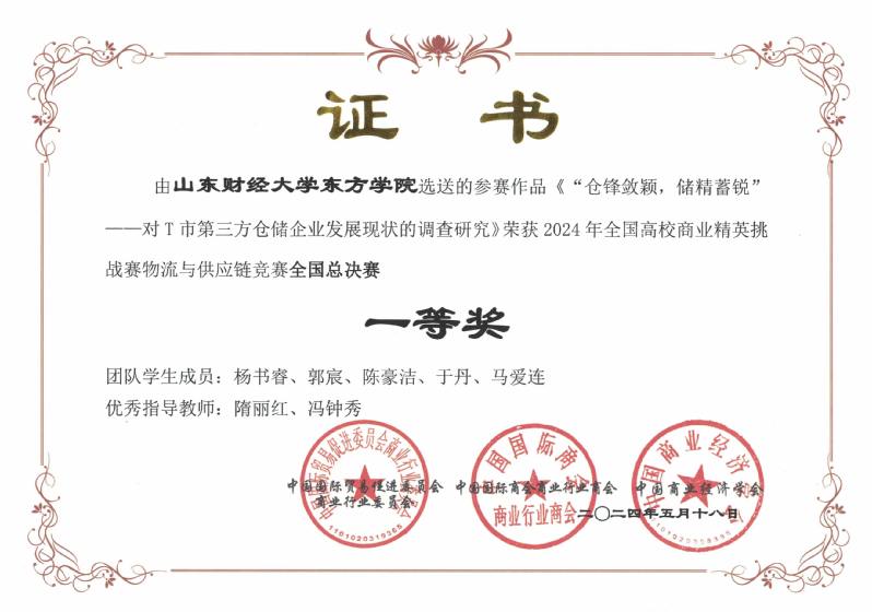 本次竞赛从今年3月开始准备,经过个人知识赛、山东省总决赛全国预选赛全国总决赛层层选拔,最终凭借扎实的专业基础和出色的发挥,获得全国一等奖的好成绩本次获奖充分展示了学校物流管理专业良好教学水平我校优化人才培养路径培养实践创新型人才促进学生全面发展提供了成功样本
