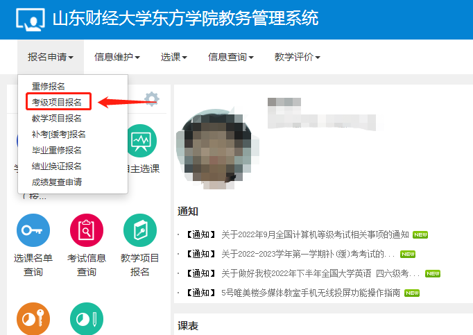 操作流程为:登录教务系统,点击“报名申请”,选择“考级项目报名”。在考级项目报名页面,学生要认真核对报名项目、考试信息,核对无误后再进行报名。