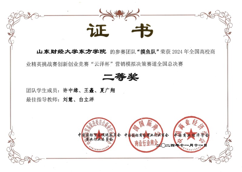 近日,2024年全国高校商业精英挑战赛创新创业竞赛“云泽杯”营销模拟决策赛道全国总决赛圆满落幕。全国高校商业精英挑战赛创新创业竞赛是全国普通高校大学生竞赛榜单中的竞赛项目,本次大赛由中国贸促会商业行业委员会、中国国际商会商业行业商会、中国商业经济学会共同主办,并于11月9日至10日在线上成功举行。我校市场营销专业的许中缘、王矗、夏广翔同学组成的参赛团队,在300余所院校的1000余支队伍中脱颖而出,斩获得全国二等奖,实现了我校在该项赛事上的新突破!
