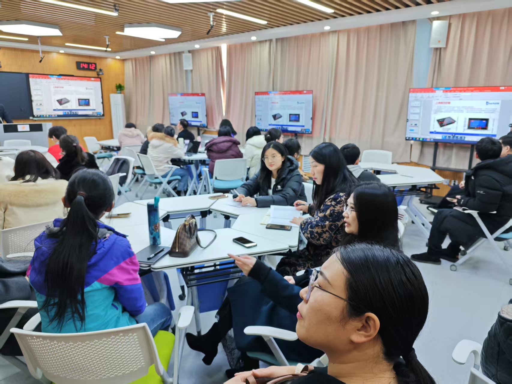 培训现场学习氛围浓厚,教师们积极提问并参与设备实操。参训教师们在精品研讨教室内分组体验了便捷投屏、实时分屏协作等功能,并结合头脑风暴、角色扮演等教学方法,深入探讨了如何通过空间重构激发学生主动性。