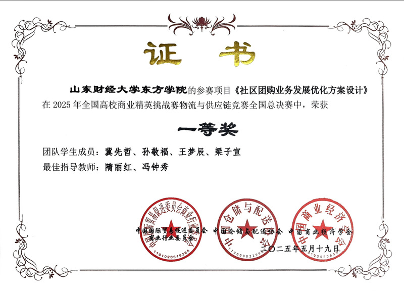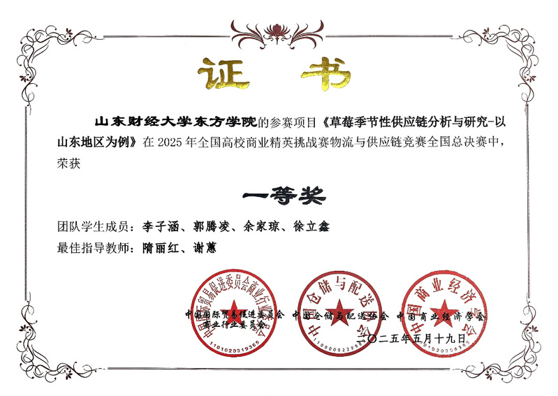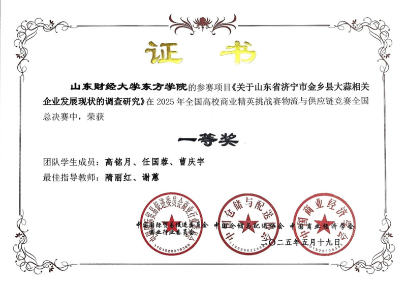 全国总决赛的竞争更为激烈,面对来自200所院校的600支团队,我校参赛团队毫不畏惧。以严谨的逻辑架构、详实的市场调研数据和精彩的视频展示,在众多队伍中成功突围。最终,《草莓季节性供应链分析与研究》《社区团购业务发展优化方案设计》《关于山东省济宁市金乡县大蒜相关企业发展现状的调查研究》3个项目荣获全国总决赛一等奖,实现了学校在该赛事全国一等奖的新突破。