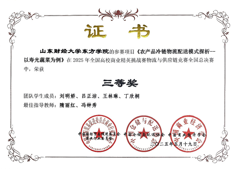 今年4月初,我校正式启动校赛筹备工作。通过线上线下相结合的广泛宣传方式,成功吸引了全校70余名学生积极踊跃参与,累计组建参赛团队20余支。学校组建了由隋丽红、冯钟秀等教师构成的专业指导团队,从选题策划的构思阶段,到数据分析的关键环节,再到报告撰写的呈现阶段,为学生提供全流程精细化辅导。经过校内的激烈比拼,5支团队凭借“物流数字化转型”“供应链韧性优化”等具有创新性的选题成功脱颖而出,以校赛前五名的优异成绩全员晋级山东省赛,充分展现出学校在学科实践教学中所取得的扎实成效。
