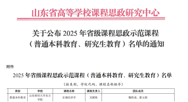 近日,山东省高等学校课程思政研究中心公布2025年省级课程思政示范课程名单,我校吴国艳教授主持的《宏观经济学》课程成功入选。这是该课程继获评省级一流本科课程后,在课程思政建设领域取得的重大突破,标志着我校在推动课程思政高质量建设、落实立德树人根本任务方面再上新台阶。