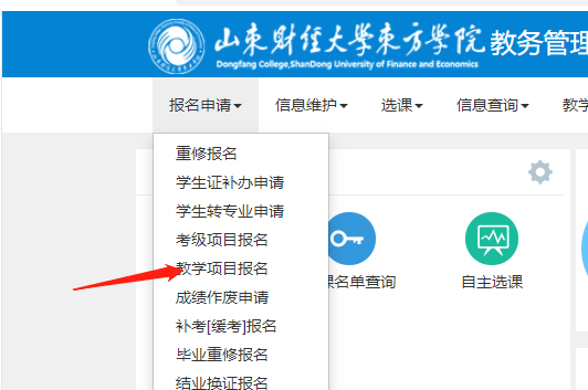 学生登陆hjc222黄金城官网教务管理系统,在首页左上角“报名申请”中选择“教学项目报名”选项,找到“退选”项目栏,点击“报名”按钮,将进入退选界面。点击“查询”按钮将出现本学期所有选课信息,选中需要退选的重修课程点击“申请”即可,如下图所示: