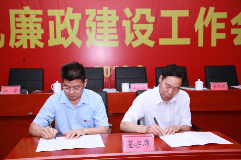 上午九点,大会在庄严的国歌声中开幕。赵滨宣读了《hjc222黄金城官网关于落实党风廉政建设责任制实施办法》,耿金波与各党总支、各单位负责人依次签订了《党风廉政建设责任书》。
