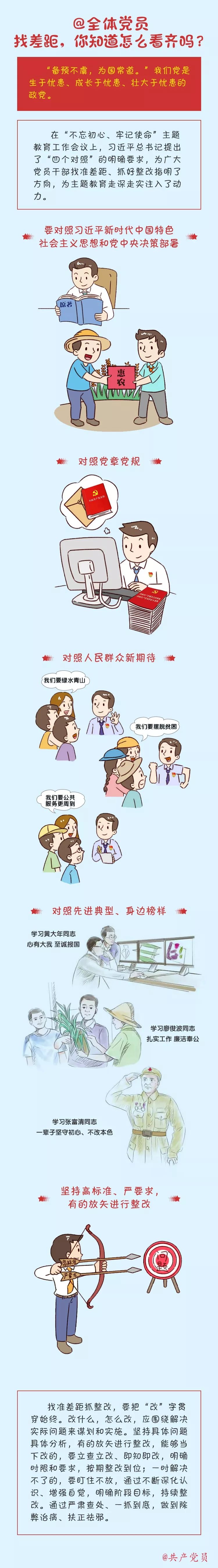 差距不找不明,问题不攻不破。开展“不忘初心、牢记使命”主题教育,找差距是要牢牢把握的总要求之一。找差距,就是要对照习近平新时代中国特色社会主义思想和党中央决策部署,对照党章党规,对照人民群众新期待,对照先进典型、身边榜样,坚持高标准、严要求,有的放矢进行整改。