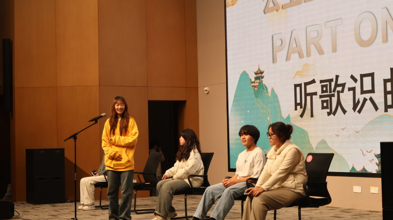 第一环节为“听歌识曲”,比赛现场播放音频,音频结束后参赛选手接抢答歌名,每组分配5道题。各组选手才思敏捷,回答迅速,展示了丰富的歌曲储备。第二个环节是看表情猜歌名,同学们看完大屏幕上的表情后,抢答歌名,选手们热情洋溢,激烈角逐,比赛如火如荼。两轮比赛结束后,共有十位同学晋级到第三轮。第三轮比赛是唱含有关键词的歌词,选手们需将自己脑中的曲库和这些关键词联系起来。参赛选手反应迅速,充分展示了他们的音乐才华和热情,同学们争先恐后的答题中也伴随着欢声笑语,同时此环节也将接歌大赛推向了高潮。
