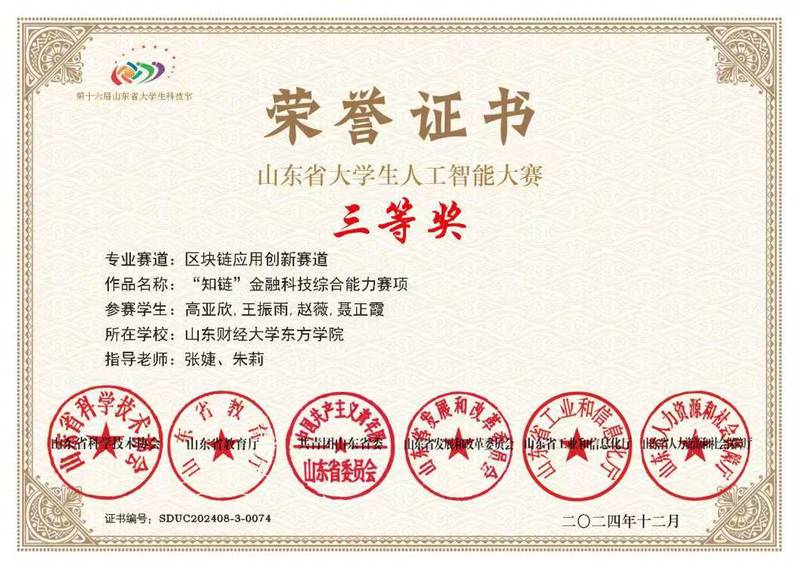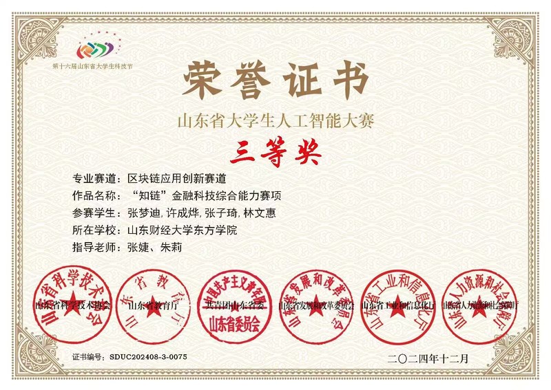 第十六届山东省大学生科技节暨第七届山东省大学生人工智能大赛在山东省科学技术协会和山东省教育厅的指导下于2024年11月圆满完赛。我院四个参赛团队在本次大赛区块链应用创新赛道“知链”金融科技综合能力赛项中表现卓越,凭借扎实的专业知识和出色的创新能力,斩获一等奖1项,二等奖1项,三等奖2项。