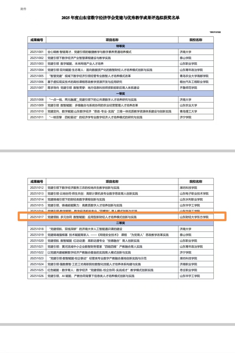 近日,山东省数字经济学会2025年度党建与优秀教学成果评选结果正式揭晓,我校财税金融学院完成的《党建领航多元协同数智赋能:应用型新财经人才培养模式创新与实践》成果,凭借鲜明的党建引领特色、深度的数智融合创新及显著的育人成效,在全省众多申报项目中脱颖而出,荣获一等奖,标志着学校在党建与数字经济教学深度融合领域的探索与实践获得权威认可。