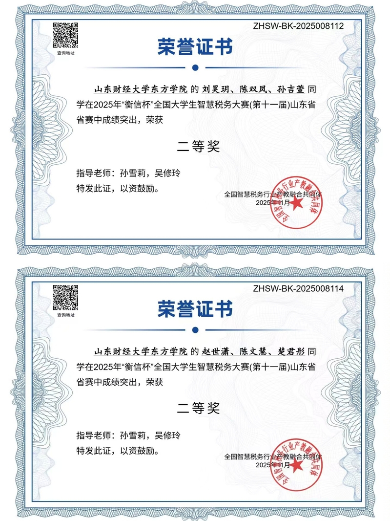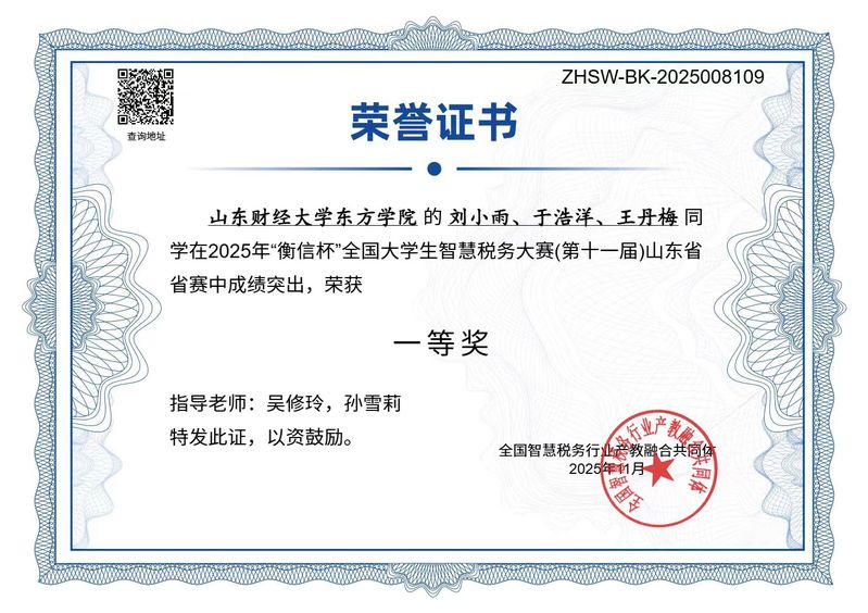 2025年“衡信杯”大学生智慧税务大赛设置校内赛、省赛、总决赛三个阶段赛。9月28日,财税金融学院组织开展校内赛,选拔出3支代表队参加省赛。11月4日,省赛如期举行,经过激烈角逐,由刘小雨、于浩洋、王丹梅组成的代表队以山东省省赛第一的成绩斩获省赛一等奖;由刘昊月、陈双凤、孙吉萱组成的代表队与赵世潇、陈文慧、楚君彤组成的代表队均获得省赛二等奖。11月29日,总决赛在江西财经大学拉开帷幕,共有来自西南财经大学、江西财经大学、海南大学、山西财经大学等知名院校在内的98支队伍入围决赛。我校代表队在高手云集的比赛中披荆斩棘,最终荣获全国三等奖。