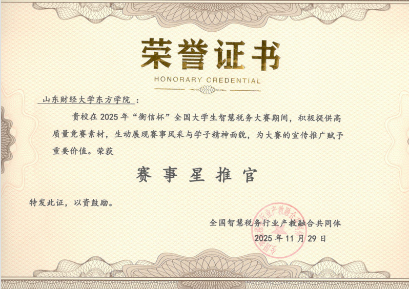 此外,我校因积极组织2025年“衡信杯”大学生智慧税务大赛校内赛,获评“赛事星推官”;吴修玲、孙雪莉两位老师荣获“最佳组织奖”。