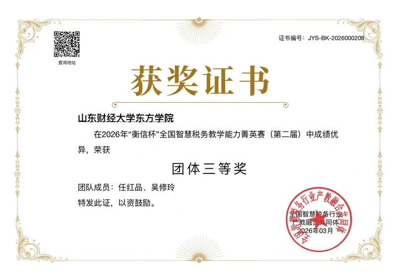 “衡信杯”全国智慧税务教学能力菁英赛紧密对接“金税四期”等税收数字化改革前沿,旨在通过全真案例模拟,全面考察与提升教师在数字化电子发票、纳税申报、税收风险管控等核心领域的实务操作能力与教学转化水平。比赛分九个模块,分别在规定时间内完成,统一开放、截止时间不同。从1月5日开赛至今两个多月的时间里,共有来自全国800余所院校的2000余名教师踊跃报名参赛。我院教师吴修玲、任红品积极备赛,表现优异,最终斩获个人二等奖一项、团体三等奖一项,展现了我院教师扎实的专业素养与教学潜力。