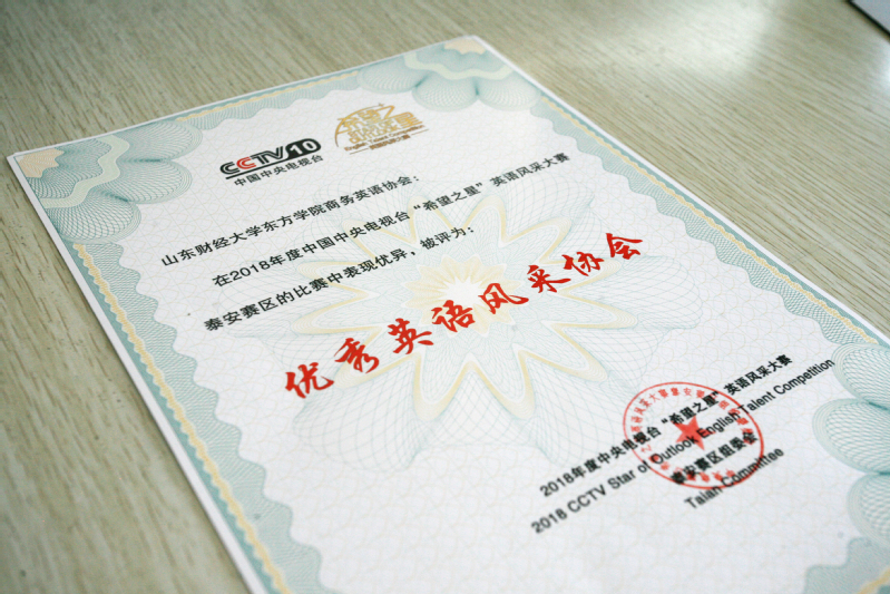 5日,在中央电视台主办的2018年度“希望之星”英语风采大赛泰安赛区中,我校国际商学院英语协会晋级决赛并获得“优秀英语风采协会”奖项。